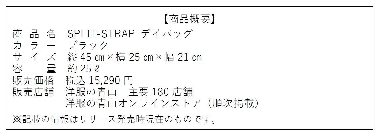 青山商事株式会社(本社:広島県福山市/代表取締役社長:青山理)とミズノ株式会社(本社:大阪府大阪市/代表取締役社長:水野明人)は、新社会人向けバックパック「SPLIT-STRAP(スプリットストラップ)デイバッグ」を共同企画し、1月23日(木)から洋服の青山主要180店舗および公式オンラインストアで発売します。