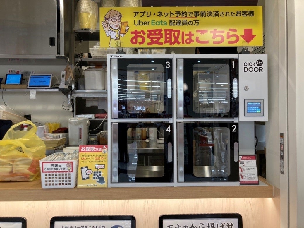 揚げたてから揚げとテリー伊藤こだわりの玉子焼き「から揚げの天才」は、顧客がWEB,アプリで事前注文した商品を非接触で受け取れる、モバイルオーダー受け取りロッカー「ピックアップドア」(製造元:株式会社寺岡精工)を5店舗で試験導入しました。この導入により、「注文」~「受取り」がスムーズになることで待ち時間のストレス低減と、テイクアウト商品を完全に非接触で提供できるため、お客様の安心感も高められます。