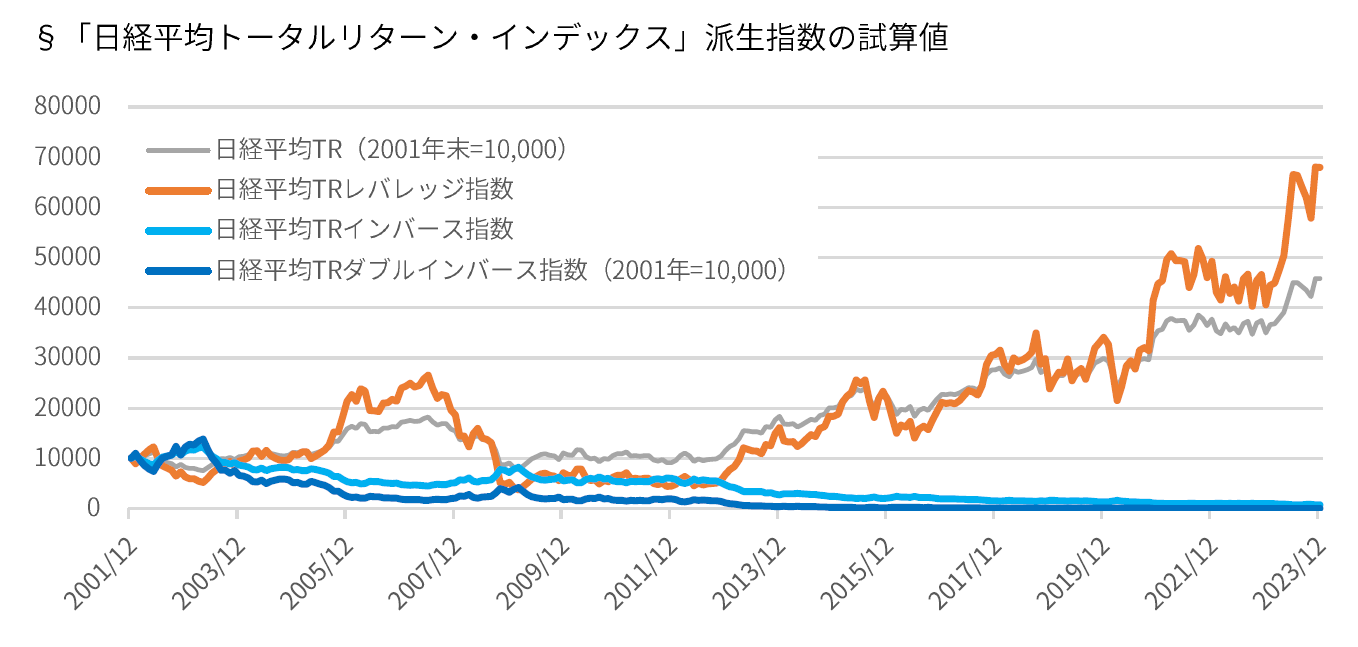 ・ 日経平均トータルリターン・レバレッジ・インデックス、日経平均トータルリターン・インバース・インデックスは、2001年末の値を10,000として遡及算出