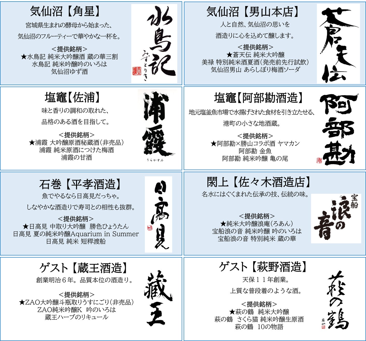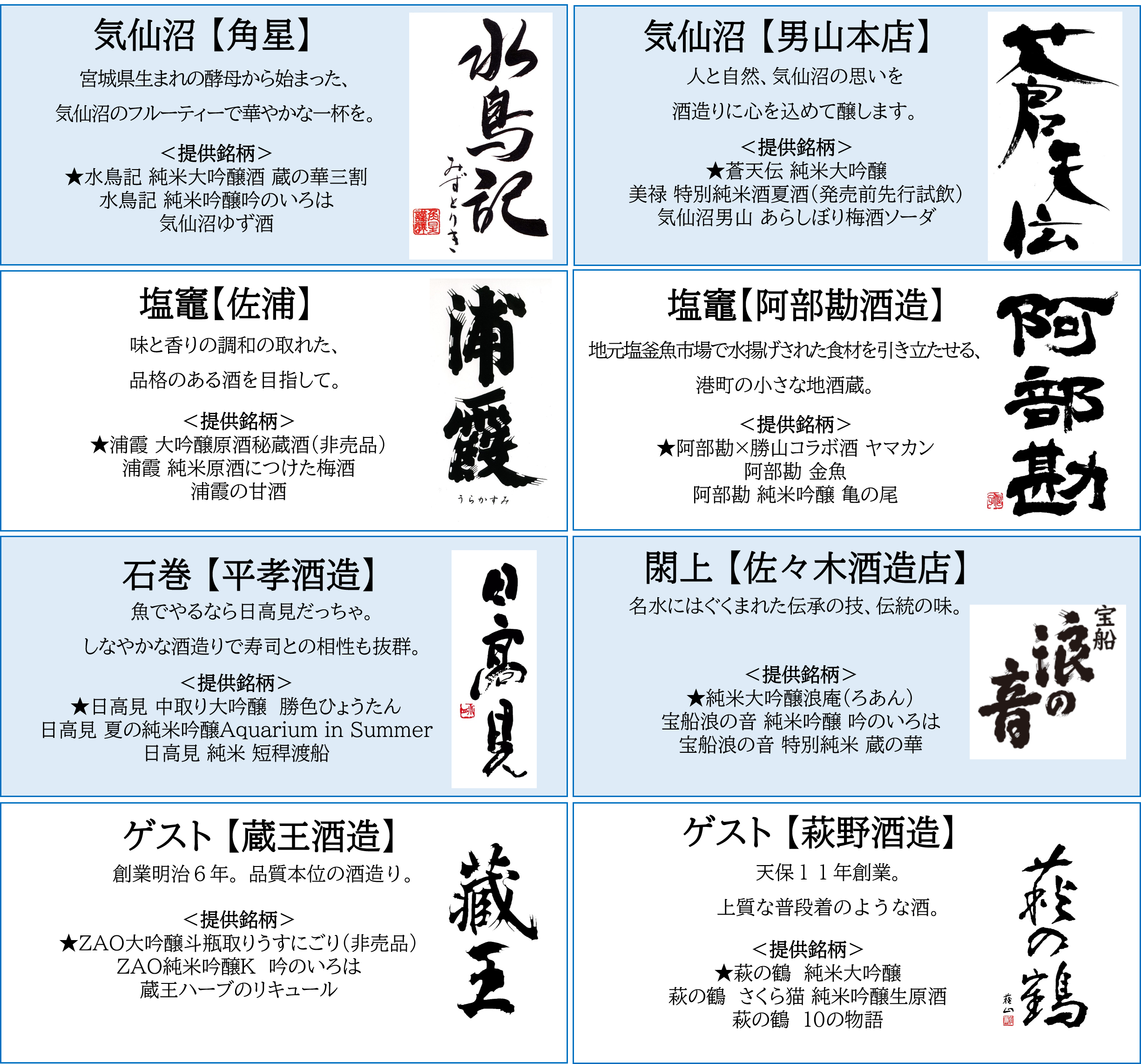 宮城を代表する8つの酒蔵が集結します。気仙沼の「角星」と「男山本店」、石巻の「平孝酒造」、塩竈の「佐浦」と「阿部勘酒造」、閖上の「佐々木酒造店」、特別出店として蔵王の「蔵王酒造」、今回初参加となる栗原の「萩野酒造」が集まり、各蔵自慢の銘酒、秘蔵酒を振る舞います。酒蔵自らがお酒を振る舞い、日本酒の魅力を伝えます。
