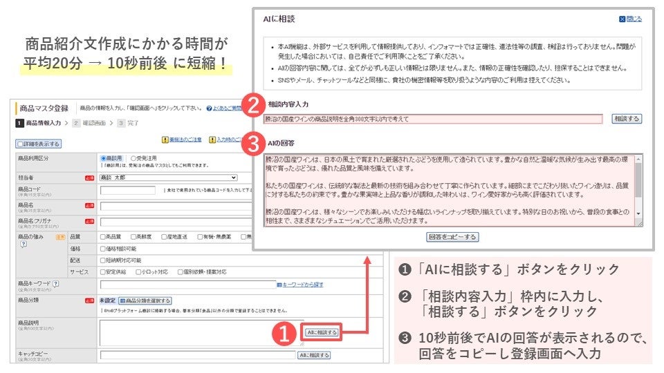 相談内容の例:「勝沼の国産ワインの商品説明を全角300文字以内で考えて」「クラフトビールのメルマガ文章を作って」