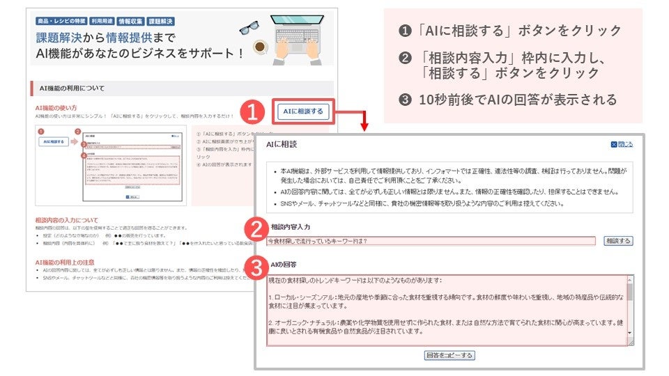 相談内容の例:「今食材探しで流行っているキーワードは?」「業態別の消費者ニーズを教えて」