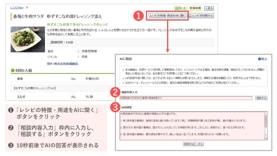 相談内容の例:「大阪府泉州で作られた春菊の特徴を教えて」「このレシピのアレンジ方法を教えて」
