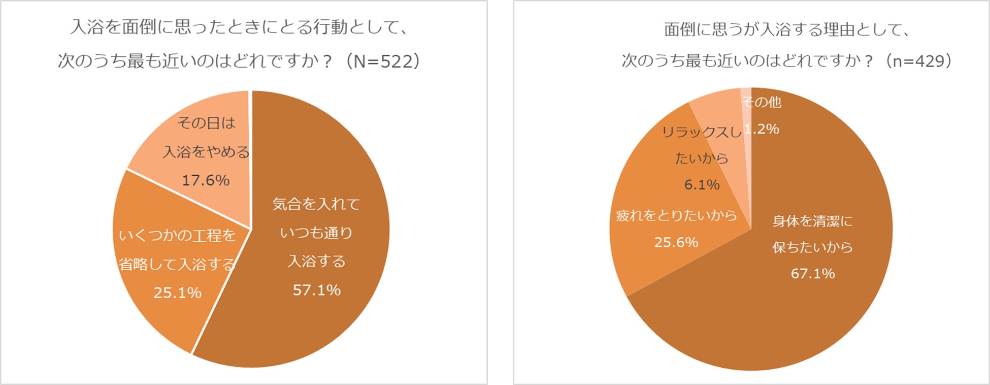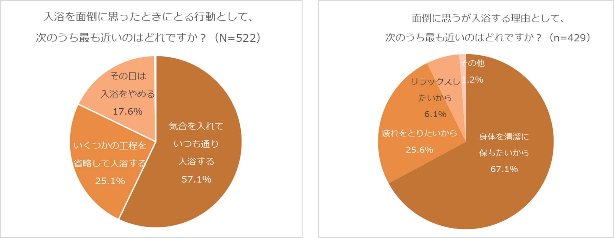 入浴を面倒に思ったときに実際にどのような行動を取るのか聞いたところ、「その日は入浴をやめる」として、お風呂をキャンセルする人は17.6%、「いくつかの工程を省略して入浴する」人は25.1%となりました。面倒に思っても、気合いをいれたり、いくつかの工程を省略するなどして入浴する理由としては、「身体を清潔に保ちたいから」が最も多く(67.1%)、次いで「疲れをとりたいから」(25.6%)、「リラックスしたいから」(6.1%)となりました。入浴を面倒に感じてもキャンセルしない理由としては、身体を清潔に保ちたいという気持ちが強くあるようです。