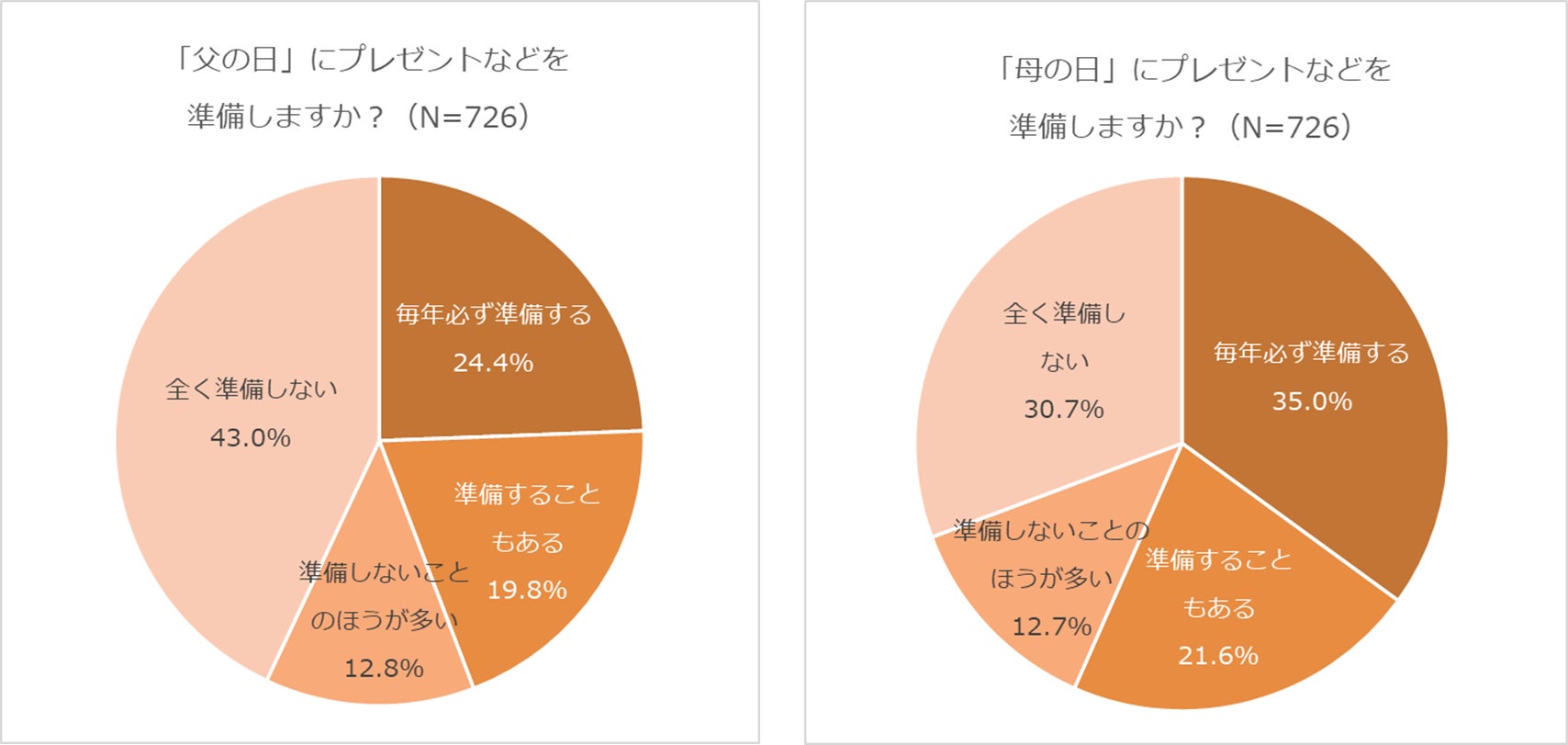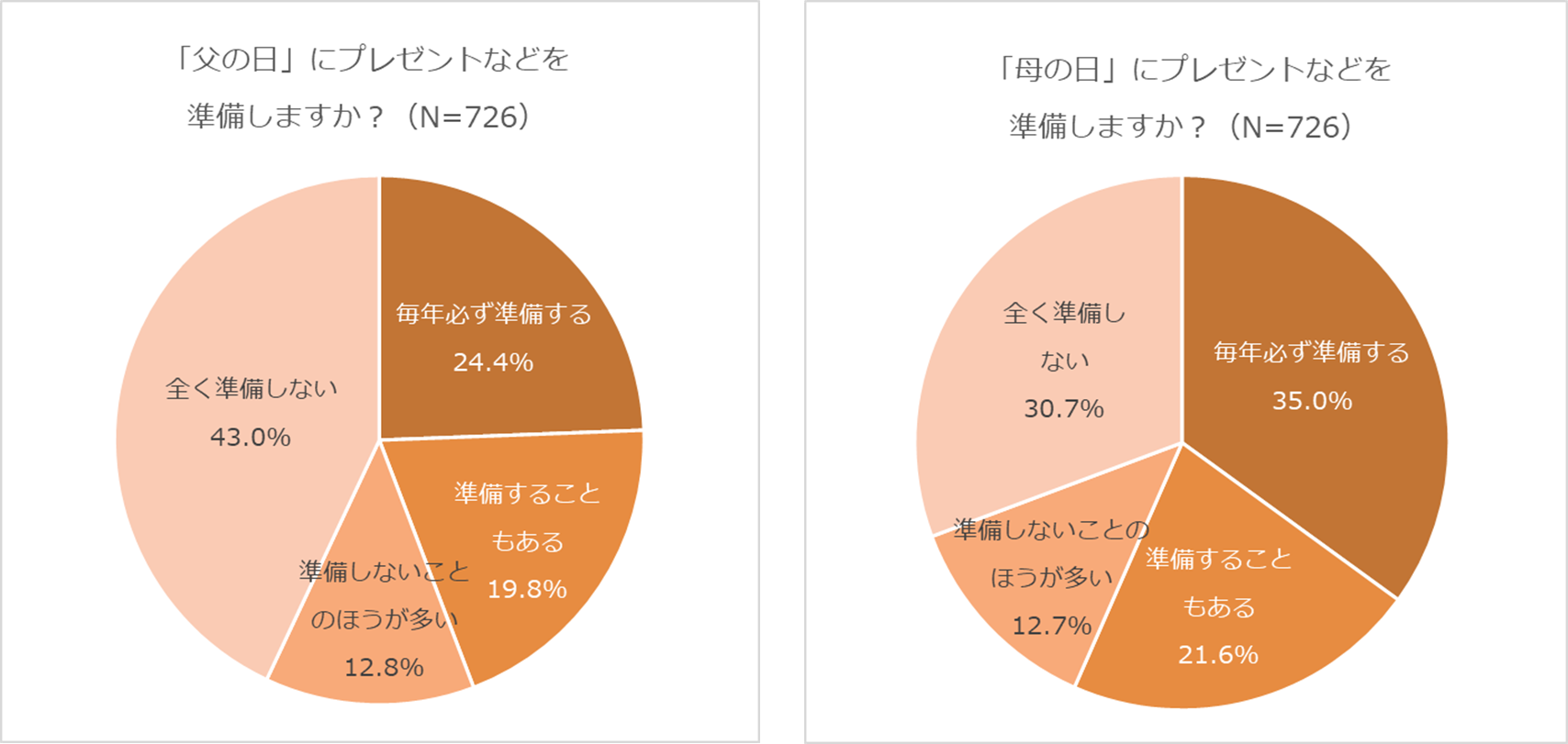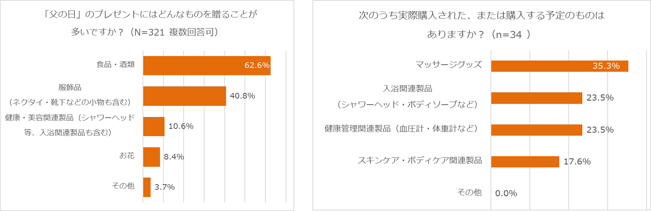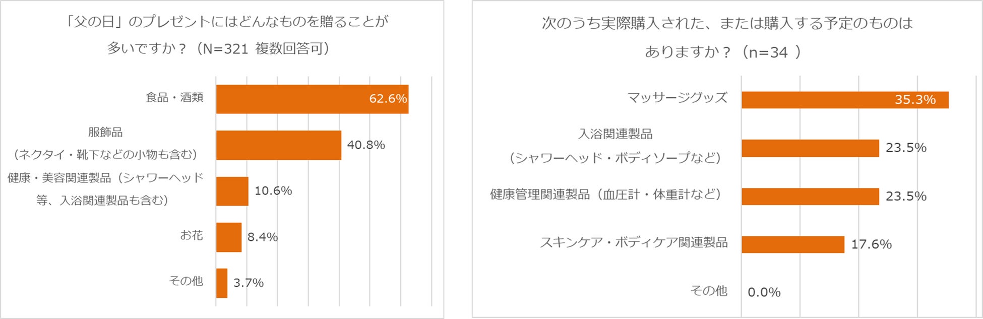 一方、プレゼントを準備する派が贈るプレゼントの1位は、「食品・酒類」(62.6%)。次いで「服飾品(ネクタイ・靴下などの小物も含む)」(40.8%)、「健康・美容関連製品(シャワーヘッド等、入浴関連製品も含む)」(10.6%)となりました。「健康・美容関連製品」と回答した人の中身を深掘りしてみると、「マッサージグッズ」が最も多く(35.3%)、次いで「入浴関連製品(シャワーヘッド・ボディソープなど)」と「健康管理関連製品(血圧計・体重計など)」が同等で23.5%となりました。父の日はやや盛り上がりに欠けるという一方で、この日が親や家族の身体や健康のことを思いやるきっかけになったという人も一定数いることが伺えます。
