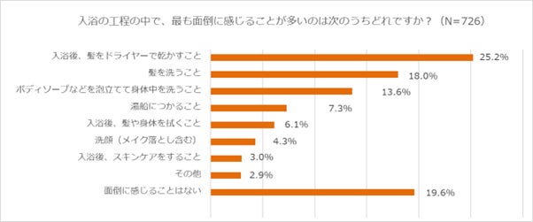 尚、面倒に感じる項目としては、髪を洗ったり、乾かしたりする工程が上位だったほか、「ボディソープなどを泡立てて身体中を洗うこと」が3位(13.6%)となりました。
