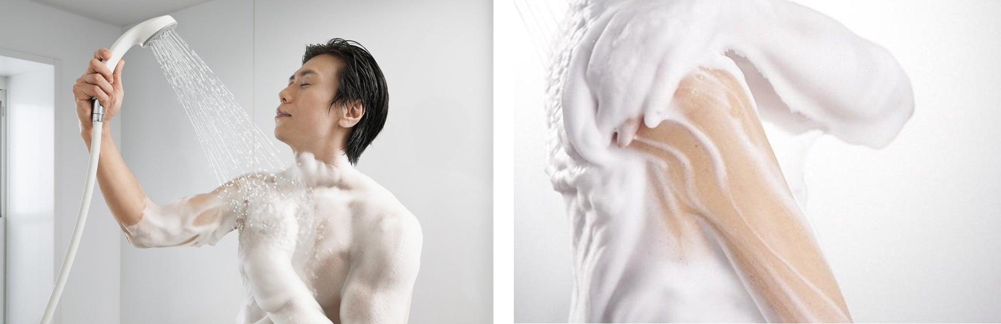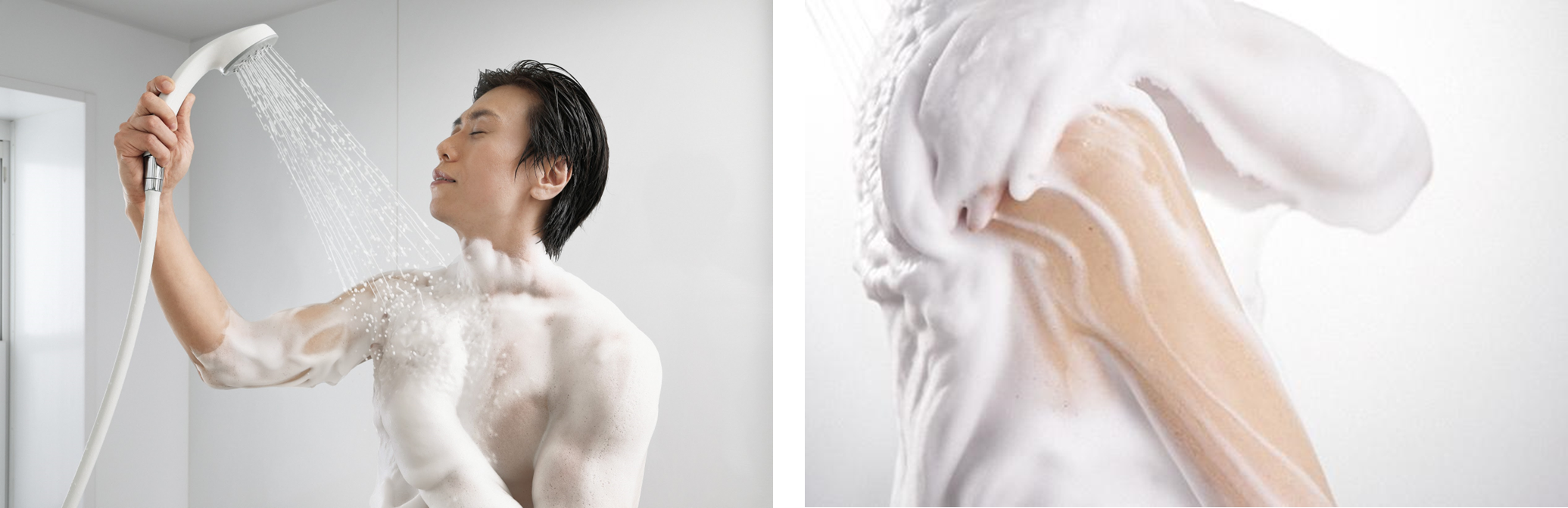 LIXILでは、面倒な入浴工程の上位にランクインしていた「ボディソープなどを泡立てて身体中を洗うこと」の負担を軽減するアイテムを提供しています。身体中を瞬時に泡で包み込むことができる泡シャワー「KINUAMI」です。