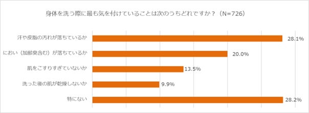 今回の調査の中で、身体を洗う際に気を付けていることを聞いたところ、「汗や皮脂の汚れが落ちているか」が最も多く(28.1%)、次いでにおいや、肌への負担が挙げられました。