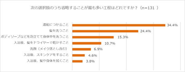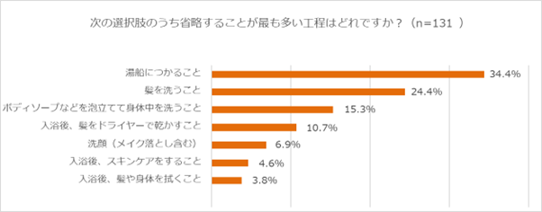 また、入浴を面倒に思ったときに「湯船につかること」を省略する人が34.4%と最も多く、次いで「髪を洗うこと」(24.4%)、「ボディソープなどを泡立てて身体中を洗うこと」(15.3%)を省略する人が多いことがわかりました。入浴の中でも、特に髪や身体を洗うという工程を面倒に感じ、疲れていたり眠い時にはそれを省略する人が多いことが伺えます。