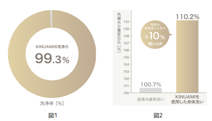 「KINUAMI」は、泡を身体に滑らせるようになで洗いすることで、肌を擦らずやさしく洗うことができます。気になる皮脂等の汚れもしっかり落とせる確かな洗浄力も実証されています(図1※2)。また専用ボディソープには、3種のヒアルロン酸(※3)、モモの葉エキス等の保湿成分が配合されており保湿力に優れているため、毎日の身体洗いを通じてボディケアを自然に取り入れることができます(図2※4)。