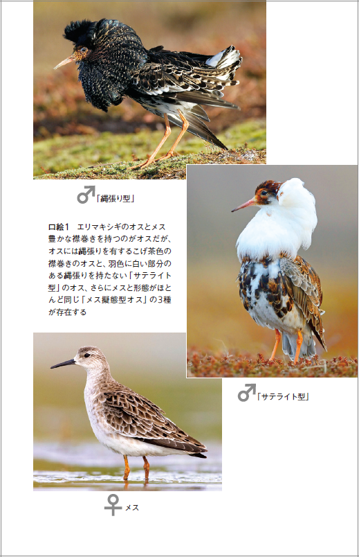 羽色に白い部分のある縄張りを持たない「サテライト型」のオス(中)、さらにメスと形態がほとんど同じ「メス擬態型オス」の3種が存在します。