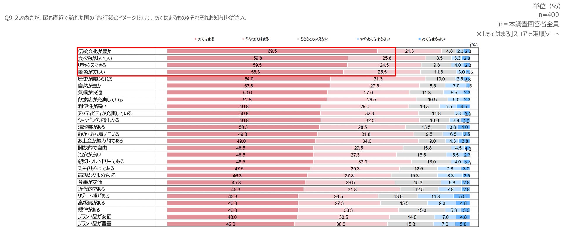 旅行後の印象は「伝統文化が豊か」は最も高いスコアを示しており、訪問前に抱いていた印象と一致した可能性がある。他にも「食べ物がおいしい」「リラックスできる」「景色が美しい」が旅行前の印象と同じく評価が高い。おおむね訪問前の期待に沿った結果であると考えられる。
