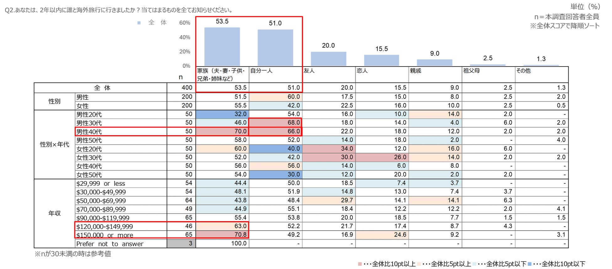 「家族」での海外旅行は男性40代が最も多く、年収が高いほど「家族」で海外旅行に行く傾向がある。