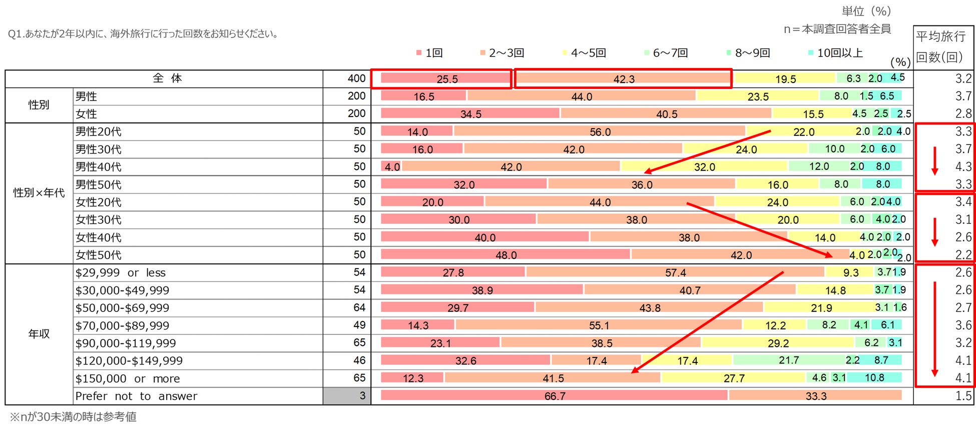 また、2回以上(複数回)海外旅行に行った人は、約75%以上いた。直近2年以内の海外旅行経験者は1年に1回以上海外旅行に行く人が多い傾向にある。