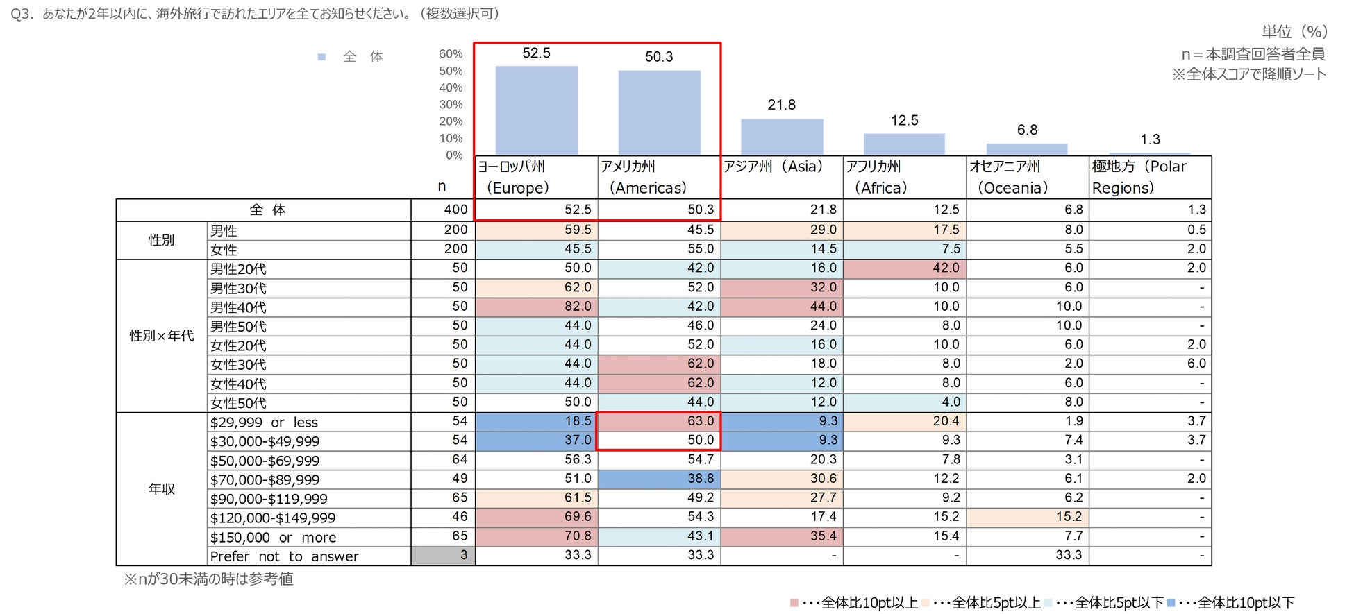 年収50,000ドル未満の層は「アメリカ州」が支持を得ており、地理的に訪問しやすいことや短期旅行などで比較的安価に海外旅行を楽しめることが一因と考えられる。