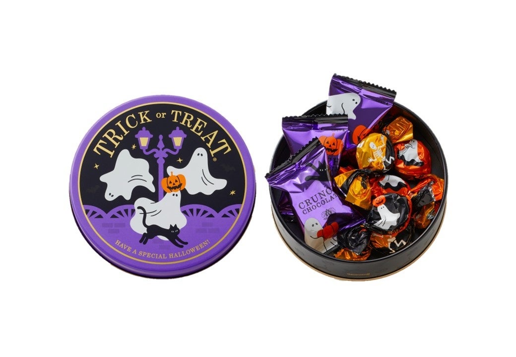 夜の町を楽しそうに歩くおばけたちを描いた丸い缶にミルクチョコレートとクランチチョコレートを