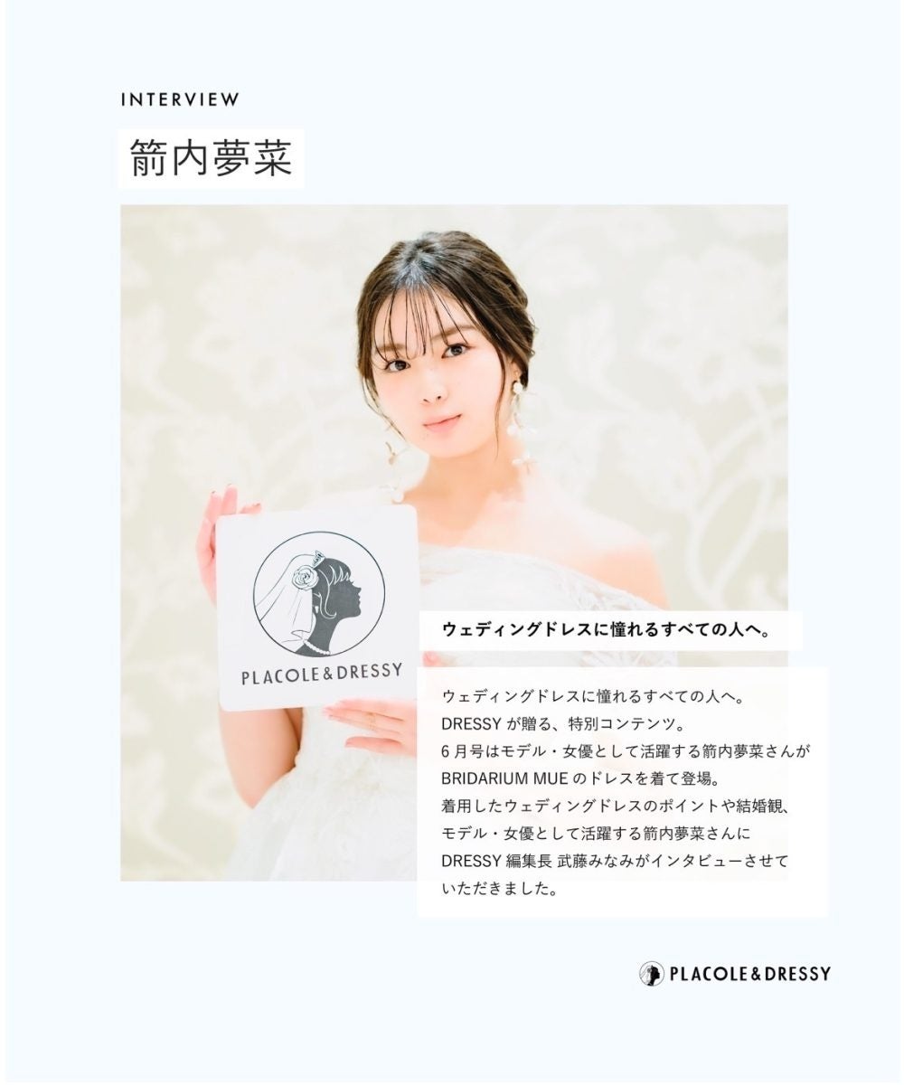 6月号は女優 箭内夢菜さんがBRIDARIUM MUEのウェディングドレスを着て登場。着用したコーディネートのポイントやウェディングドレスの魅力、女優として活躍する箭内夢菜さんについて DRESSY編集長 武藤みなみよりインタビューさせていただきました。