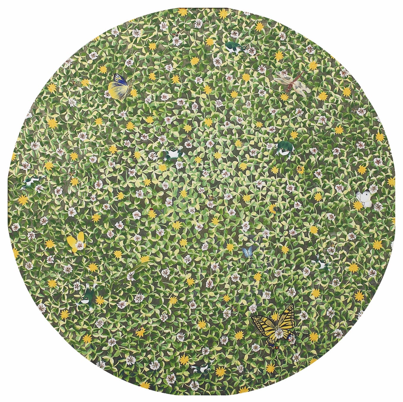 コロナ下で、ふと足元を見つめた先に生き物たちの生き輝く姿を見つけました。シロツメグサの群生の中に、私の大好きな蛙や虫達の息衝きを感じました。そんな姿を、時代や国境を越えて伝え残したいという気持ちを込めて描きました。大きな円は、満月の中を覗く様なイメージで自然界を見つめます。仮額を外すと、見る角度で側面も楽しめます。