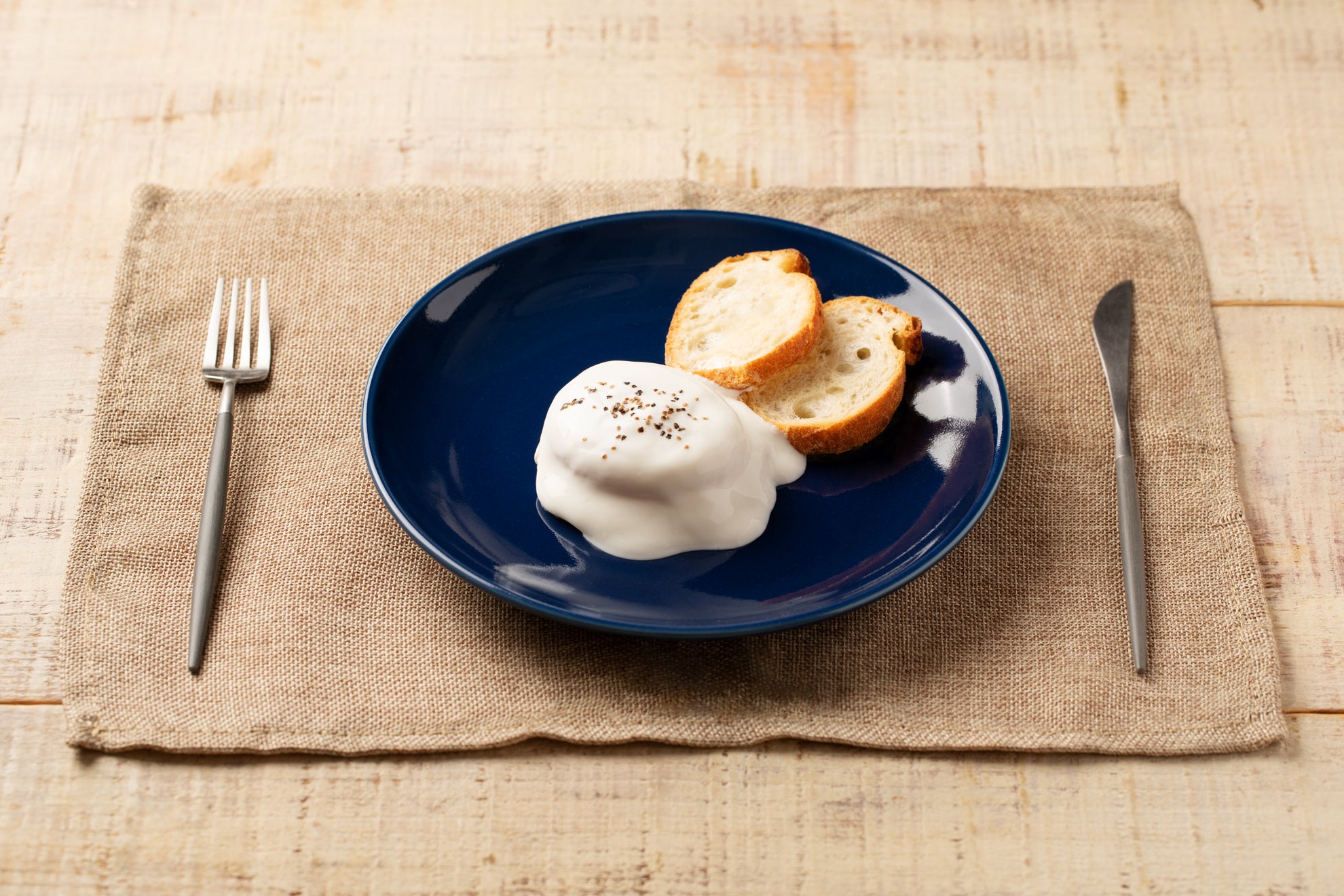 見た目はヨーグルトのように真っ白で、ポーチドエッグに切れ目を入れると中から鮮やかな半熟卵が!混ぜずにそのままひと口、卵と混ぜてひと口…と楽しみ方は自由。最後は、とろりとした黄身とミックスして、ねっとり濃厚な味わいとヨーグルトの爽やかな酸味とアンチョビの塩味がクセになる逸品です。