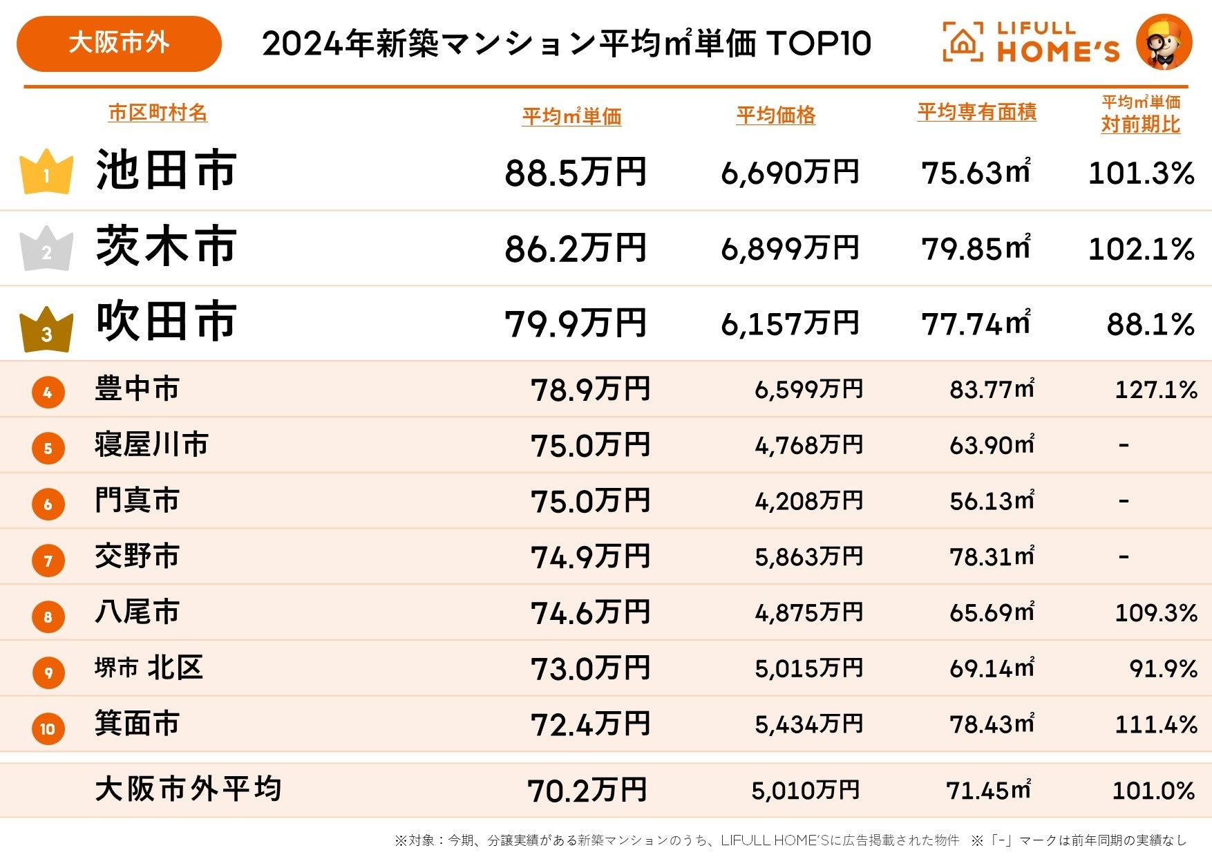 大阪市を除いたエリアの新築マンションの平均㎡単価1位は「池田市」の88.5万円(前期比101.3%)、2位は「茨木市」の86.2万円(同102.1%)と前期比100%超えの80万円台の市がランクインしました。
