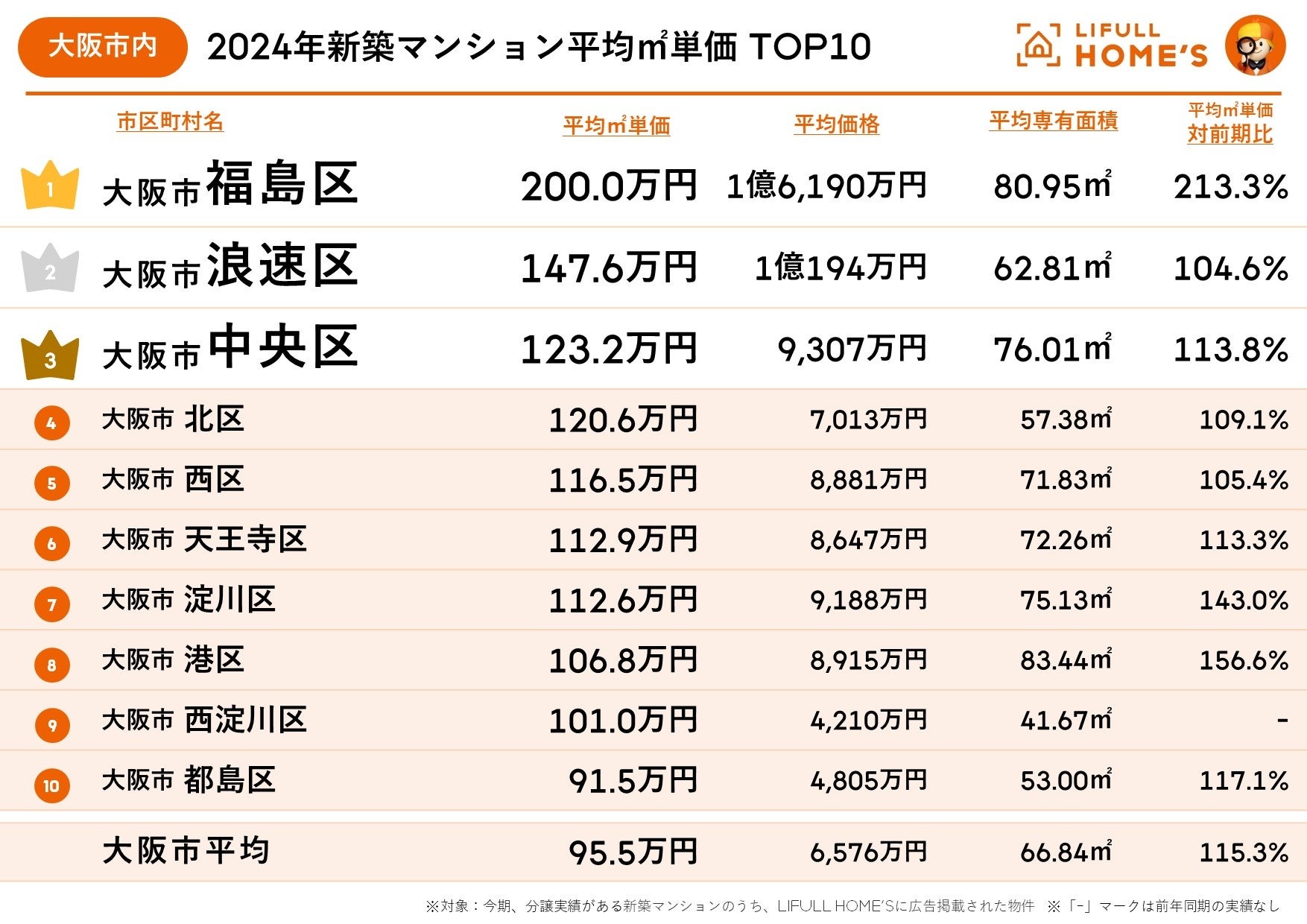 大阪市内の新築マンションの平均㎡単価1位は「大阪市福島区」の200.0万円で、前年の同じ時期と比べて213.3%と2倍以上の価格に達しています。平均価格も1億6,190万円とTOP10内で飛びぬけた価格でした。2位は「大阪市浪速区」の147.6万円(前期比104.6%)は、3位は「大阪市中央区」の132.7万円(同113.8%)が続きます。大阪市内の平均㎡単価は95.9万円ですが、TOP10は㎡単価100万円以上の区が多くランクインしています。