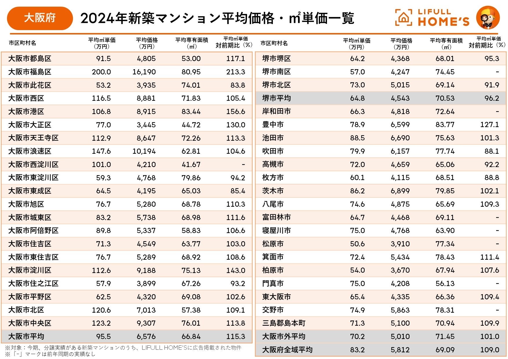 大阪府内の市区町村別での平均価格、平均㎡単価一覧もあわせてご覧ください。