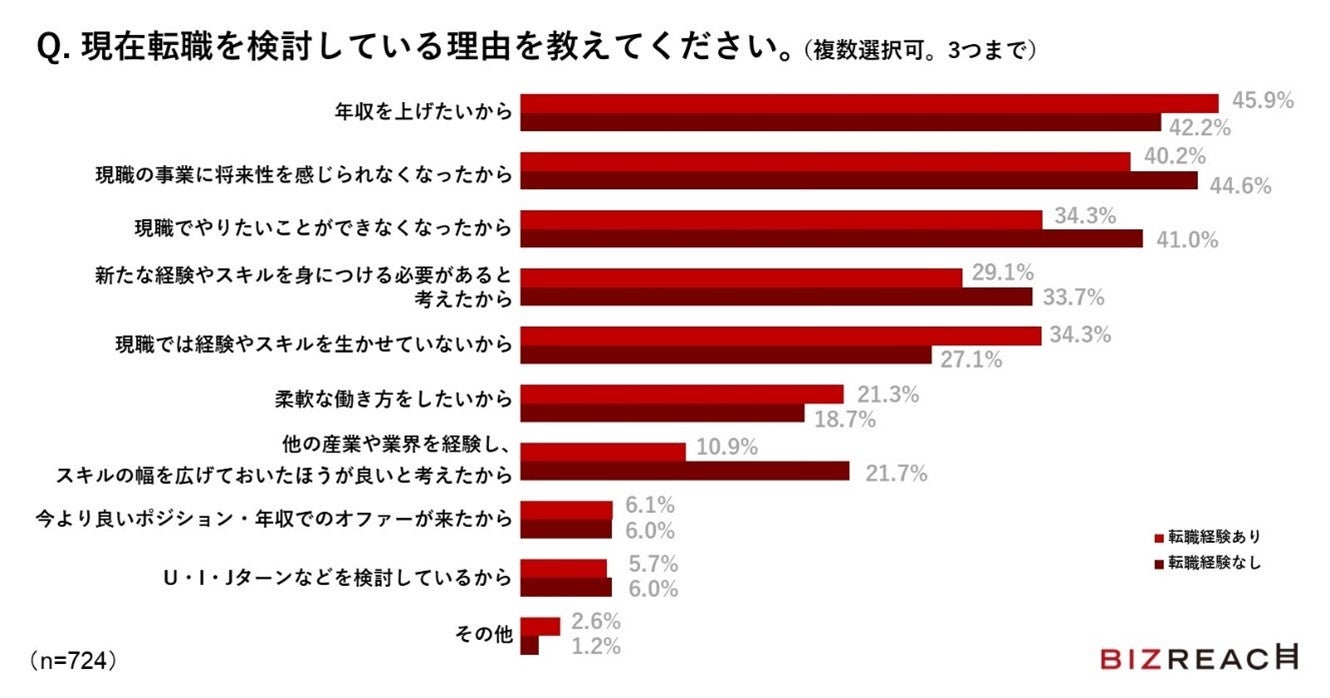 転職経験があるビジネスパーソンは「年収を上げたいから(45.9%)」が最も多い一方で、転職経験のないビジネスパーソンは「現職の事業に将来性を感じられなくなったから(44.6%)」が最も多い結果となりました。