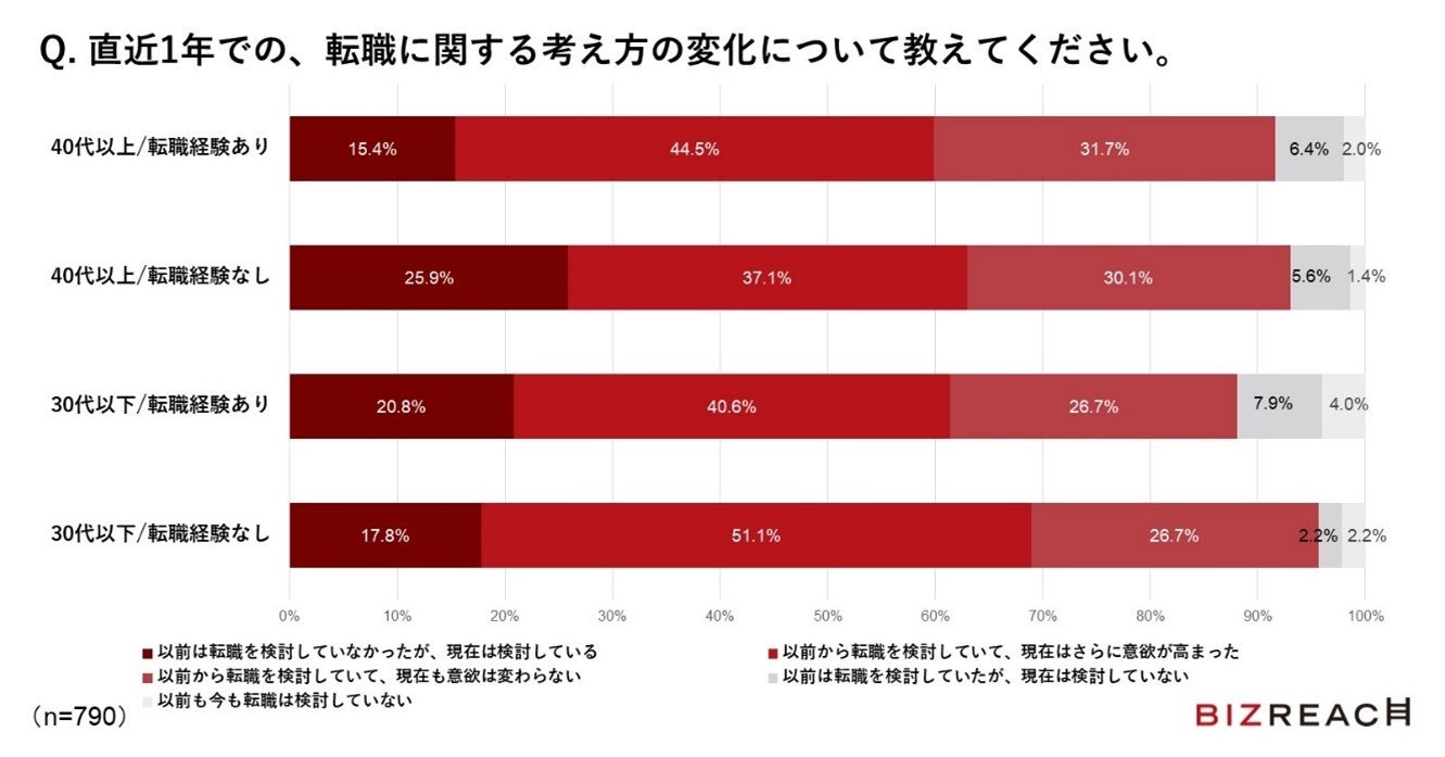 今回の調査で、転職経験のないビジネスパーソンやこれまでは転職に消極的だった層も転職を検討し始め、特にビジネス経験豊富な40代以上の転職に対する意識が変化していることがわかる結果となりました。