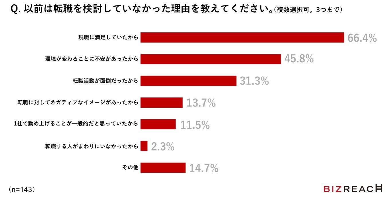 また、「以前は転職を検討していなかったが、現在は検討している」と回答したビジネスパーソンに転職を考えなかった理由を聞いたところ、「現職に満足していたから(66.4%)」が最も多い結果となりました。また「転職に対してネガティブなイメージがあったから(13.7%)」や「1社で勤め上げることが一般的だと思っていたから(11.5%)」といった転職や従来型の雇用慣行に対する意識の変化があったビジネスパーソンが一定数いることが分かります。