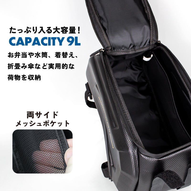 水筒や着替え、弁当や折りたたみ傘など実用的な荷物を収納できる容量9Lの大容量モデルです。ツーリングだけではなく、自転車通勤など日々のサイクルライフに最適なキャリアバッグです。