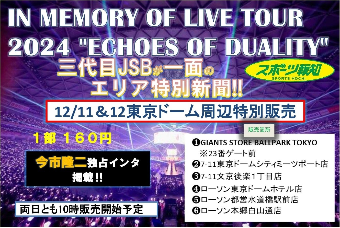 スポーツ報知を発行する報知新聞社(代表取締役社長・依田裕彦)は12月11、12日に東京ドームで開催される三代目 J SOUL BROTHERSの東京ドーム公演を記念して、両日とも特別1面紙面を東京ドーム周辺で販売します。今市隆二の独占インタビューを掲載した特別1面紙面。お越しの方はぜひお買い求めください。