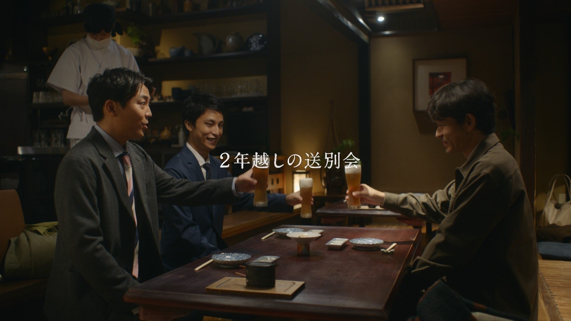 2年越しで実現した送別会に参加できたのは、わずか3人。しかし「2年も経って2人も集まったの、すごくないですか?」と、同じ職場で苦楽を共にした3人は、幸せな気持ちに浸りながら「一番搾り」で乾杯します。