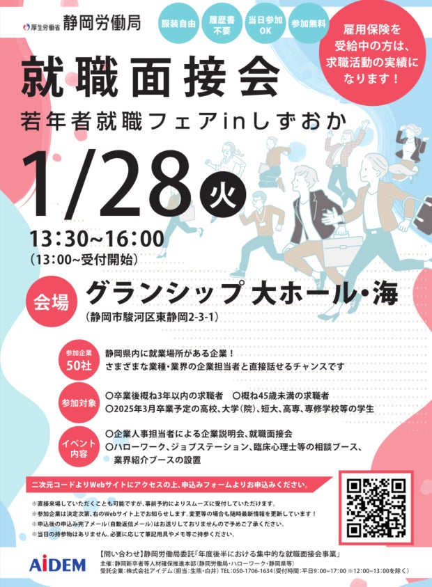 静岡新卒者等人材確保推進本部(静岡労働局、ハローワーク、静岡県等)は、2025年3月卒業予定の高校生・大学生等、既卒3年以内の方及び概ね45歳未満の方を対象とし、合同企業説明会・就職面接会を開催します