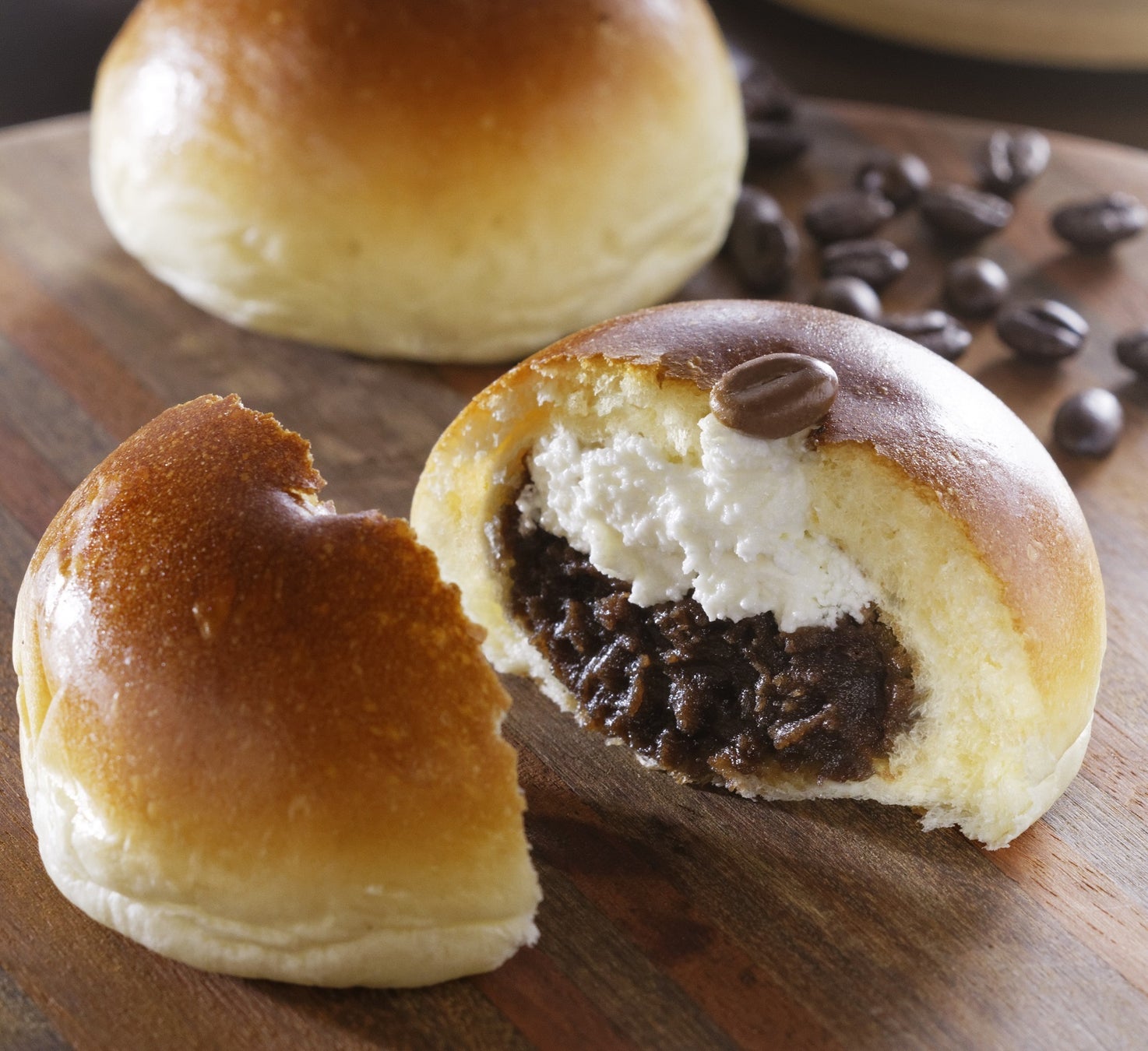 「珈琲あんぱん」は、1999年の発売から絶大な人気を誇る看板商品。エスプレッソを自家配合したこしあんに、軽い食感の純生クリームを絞った冷やしておいしい「アイスカフェラテ」あんぱんです。
