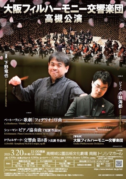 令和7年3月20日(木曜日・祝日)、高槻城公園芸術文化劇場で大阪フィルハーモニー交響楽団による公演が開催。指揮者下野竜也氏とピアニスト小林海都氏を迎えて、ドボルザーク作曲「交響曲第8番」、シューマン作曲「ピアノ協奏曲イ短調」などクラシックの名曲を演奏します。