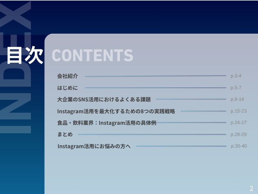 本レポートでは、Instagramを活用し、企業のブランディング・採用強化・販路拡大を図るための「8つの実践戦略」を中心に、部門横断型の運用体制の構築方法や食品・飲料業界における活用事例を紹介しています。