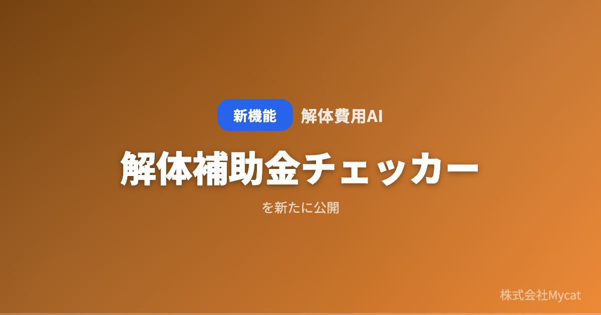 株式会社Mycat(本社:東京都目黒区)は、AI解体費用診断サービス「解体費用AI」(https://kaitai.xyz)をご利用の方に向けて、住所と建物情報を入力するだけで利用可能な自治体の解体補助金を検索できる「対象チェッカー」を公開しました。ツールURL: https://kaitai.xyz/tools/subsidy-checker### 空き家問題の深刻化と解体補助金の広がり総務省の住宅・土地統計調査(2023年)によると、全国の空き家数は約900万戸に達し、空き家率は13.8%と過去最高を記録しました(出典:総務省 住宅・土地統計調査 2023年)。2023年12月に施行された改正空家等対策特別措置法では、従来の「特定空家」に加え、「管理不全空家」のカテゴリが新設されました。管理不全空家に指定されると、固定資産税の住宅用地特例(最大6分の1に減額)が解除される可能性があります。こうした背景から、建物を解体して更地にする選択肢を検討する所有者が増えています。その際に大きな負担となるのが解体費用です。木造住宅の場合、一般的に坪3万〜5万円、30坪の住宅で90万〜150万円程度が目安とされています。一方で、多くの自治体が空き家対策の一環として解体費用の補助金制度を設けていますが、補助金の名称・対象要件・上限額・申請期限は自治体ごとに大きく異なります。国土交通省の空き家対策総合支援事業をベースとしつつも、各自治体が独自の上乗せ制度を設けているケースもあり、網羅的に情報を収集するのは容易ではありません。### 対象チェッカーの仕組み対象チェッカーは、3つの情報を入力するだけで、その条件に該当する補助金制度を一覧表示します。**入力項目**- 建物の所在地(都道府県・市区町村)- 建物の構造(木造/鉄骨造/RC造)- 築年数(おおよそで可)**出力結果**該当する自治体の補助金制度について、以下の情報を表示します。- 制度名称- 補助金額の上限(例:上限50万円、費用の1/2以内)- 主な対象要件(空き家認定の条件、所有者の要件、建物の築年数要件等)- 申請受付期間と申請先- 注意点(予算上限に達し次第終了する制度が多い旨の注記)補助金制度は年度ごとに内容が変更されることがあるため、データは定期的に更新しています。表示される情報はあくまで概要であり、正式な要件は各自治体の窓口にて確認してください。### 活用シーン 1: 相続した空き家の処分検討親から相続した空き家について「解体すべきか、売却すべきか」を判断する際、解体費用と補助金額の差額を事前に把握できれば、判断材料の一つになります。たとえば解体費用が120万円と見積もられ、自治体の補助金が50万円利用できる場合、実質負担は70万円です。更地にした後の土地の売却見込み額と比較して、経済的に合理的かどうかを判断できます。「解体費用AI」の診断機能と組み合わせることで、費用の概算から補助金の確認までをワンストップで行えます。相続税の申告期限は相続発生から10ヶ月、空き家の譲渡所得の3,000万円特別控除の適用期限は相続発生から3年以内の譲渡です(出典:国税庁 空き家の発生を抑制するための特例措置)。期限のある判断だからこそ、早い段階で費用の全体像を把握することが重要です。### 活用シーン 2: 老朽化した自宅の建て替え検討築40年以上の木造住宅に住んでいる場合、耐震基準を満たしていないケースがあります。1981年5月以前に建築確認を受けた建物(旧耐震基準)の場合、自治体によっては耐震改修とは別に解体費用の補助金が用意されていることがあります。対象チェッカーで補助金の有無を確認し、建て替えの総予算に補助金を組み込むことで、資金計画の精度が上がります。### 活用シーン 3: 不動産事業者の仕入れ判断不動産事業者が古家付き土地を仕入れる際、解体費用は仕入れコストに直結します。物件所在地の補助金制度を事前に調べることで、仕入れ判断の材料として活用できます。複数の候補物件を比較する際に、補助金の有無が判断を左右するケースも少なくありません。### 補助金データの精度について本ツールに掲載する補助金情報は、各自治体が公表する公式情報に基づいています。ただし、補助金制度は予算の執行状況により年度途中で受付を終了することがあります。また、制度の改廃は自治体の判断により随時行われるため、最新情報は必ず各自治体の窓口または公式サイトにてご確認ください。今後は、解体業者の見積もり相場データとの連携や、解体後の土地活用シミュレーション機能など、空き家の処分に関する意思決定を一貫して支援する機能を追加してまいります。▼ 本件の詳細https://kaitai.xyz/tools/subsidy-checker■ 会社概要社名: 株式会社Mycat設立: 2025年2月5日所在地: 東京都目黒区三田2-7-22事業内容: AIを活用した中小企業・個人向けサービスの企画・開発・運営最新のお知らせ: https://kaitai.xyz/newsコーポレートサイト: https://mycat.businessお問い合わせ: info@mycat.business---## コンプライアンスチェック- [x] 新規性: 解体補助金対象チェッカーの公開 → OK- [x] 最上級表現: なし → OK- [x] 禁止ワード: なし → OK- [x