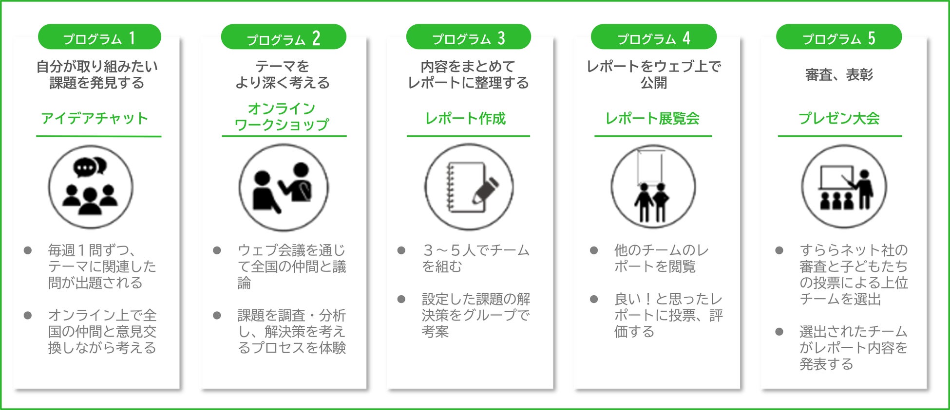今回のイベントは、社会で役立つ実践的なプログラム、唯一の正解が存在しない社会性の高いテーマへの挑戦、他者とICTを使った交流で多様性とネットコミュニケーションリテラシーの獲得という従来からの当社の探究型イベントの基本コンセプトはそのままに、探究学習のステップを5つのプログラム(課題発見、調査分析、レポート作成、発表、評価)に分けて、ひとつずつ無理なく進められる構成になっています。