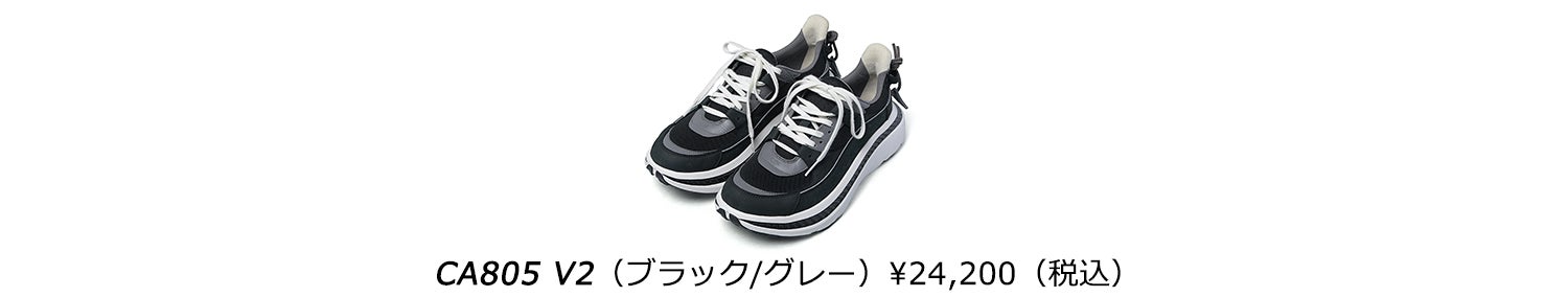 ジェンダーレスなCA805 V2スニーカーの複雑なレイヤーをいかした、モノトーンルックが特徴