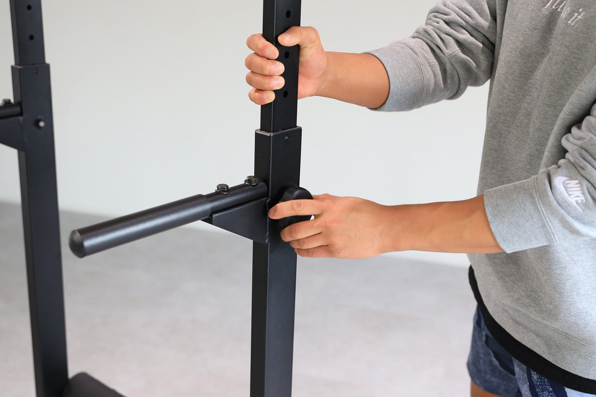 165~200cmまでの8段階の高さ調整に対応。自分好みの高さでトレーニングが可能です。ストレッチ目的の適度な高さから、足のつかない上半身を鍛えられる高さまで、メニューやその日の気分に合わせて自由に高さを変えることができます。調整はフレームをお好みの高さに合わせて両サイドにあるボルトで固定するだけ。手軽に行えるのもポイントです。