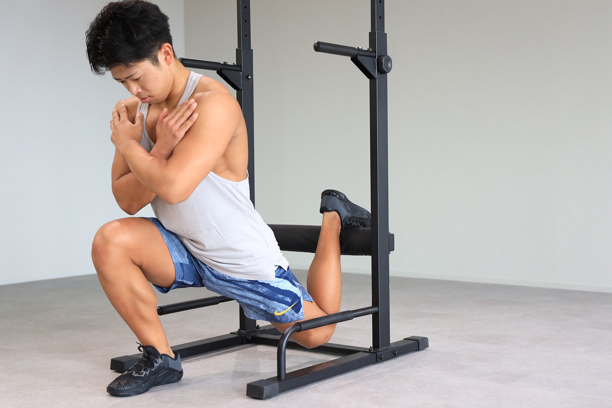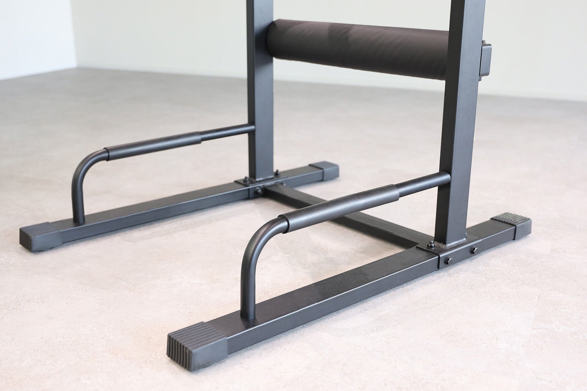 中央から縦に伸び、湾曲して横に伸びていくバーの仕様は通常のグリップに加えパラレルグリップ(縦握り)も可能。パラレルグリップは手首に負担をかけにくく、初心者の方でも使いやすい仕様です。また、中央にスペースが空いており、懸垂をした際に頭が抜けるため、トレーニング時のストレスを軽減し懸垂の動作をスムーズに行うことができます。