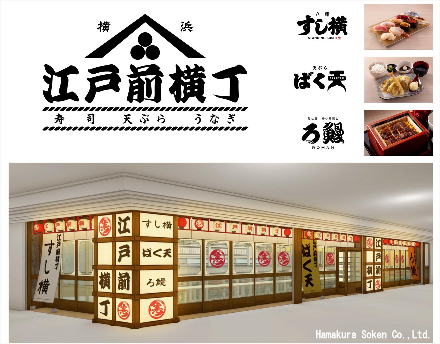 今朝獲れで届く横浜近海の地物の魚を使い、職人が手早く握る江戸前屋台寿司の「立鮨 すし横」、各地から厳選した旬の食材を採り入れ、揚げたてをお届けする「天ぷら ばく天」、宮崎で徹底した養殖環境のもと育てられた国産うなぎをせいろ蒸しやかば焼きで味わう「うなぎ ろ鰻」、3業態が融合した新しい横丁文化をお楽しみください。