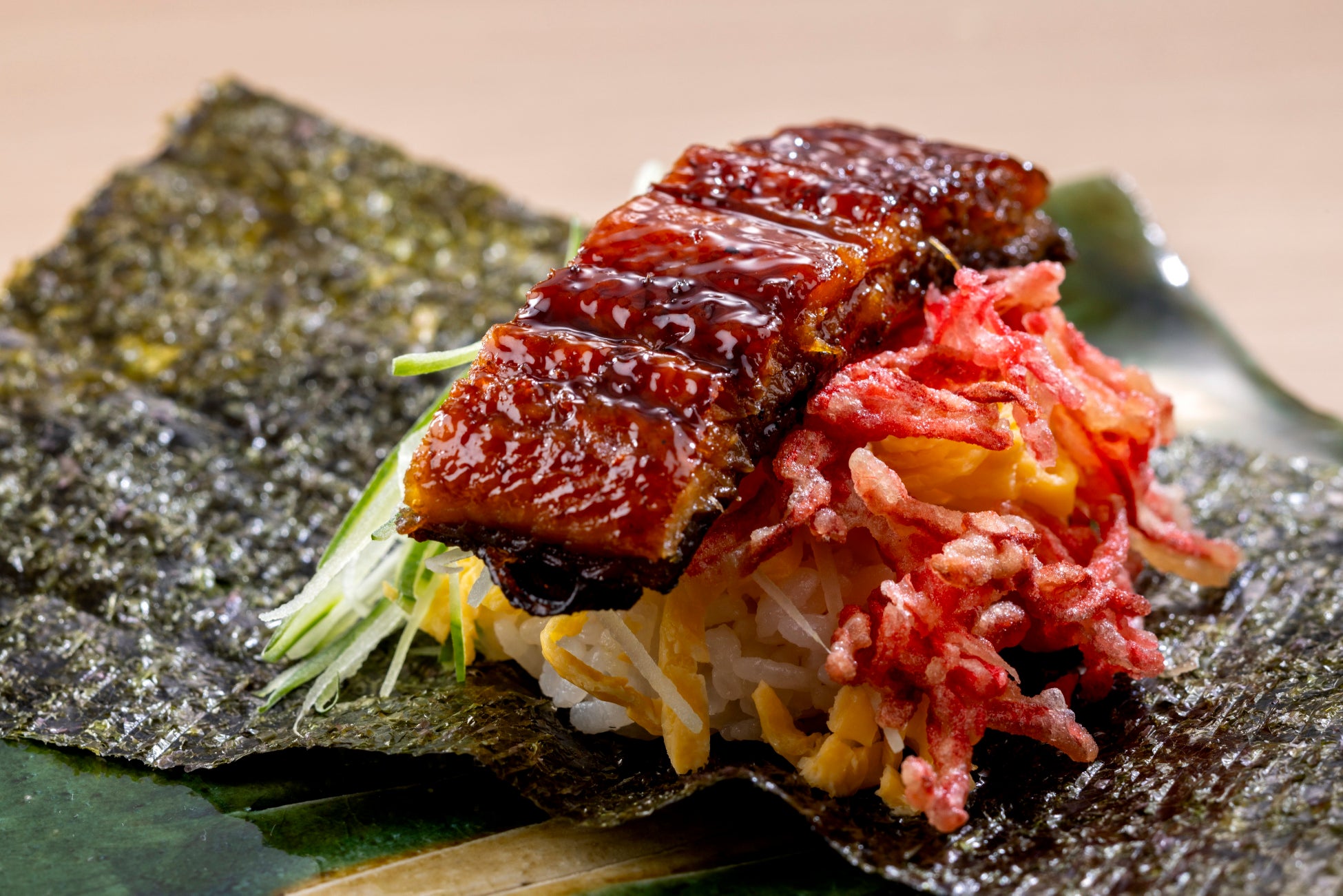 すし横で使用する赤酢のシャリに、うなぎ・紅しょうが天・きゅうり・錦糸卵を乗せ、海苔で巻いて食べる江戸前横丁だけのオリジナルメニュー。