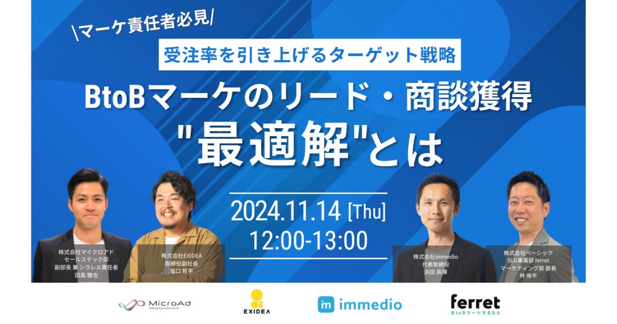 BtoBマーケティングのお困りごとをまるっと解決するサービス『ferret(フェレット)』を運営する株式会社ベーシック(本社:東京都千代田区、代表取締役:秋山勝、以下「当社」)は11/14(木)に株式会社マイクロアド(東京都渋谷区、代表取締役 社長執行役員:渡辺 健太郎)が主催するウェビナー「BtoBマーケのリード・商談獲得"最適解"とは」に登壇いたします。