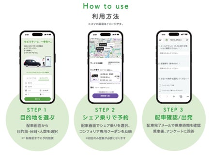 移動手段はシェア乗りタクシーで、配車はニアミーが開発する「最適化アルゴリズムを活用し、利用者が指定した地点に効率的にピックアップを行うシステム」を使用することで、効率的にCOMFORIA居住者の移動を便利にし、居住者満足度のさらなる向上を目指します。