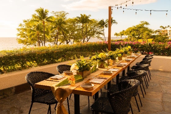 今回、新たに取り扱いを開始する当会場では、ハワイ島ならではの、美しい海と溶岩の海岸線を目の前にしたガーデン挙式が叶います。当社オリジナルの会場装飾には、トロピカルグリーンとホワイトのカラーを取り入れ、ハワイ島の自然に溶け込むデザインになっています。会場のお花は、「純粋な愛」という花言葉のある、高貴なイメージの胡蝶蘭でデコレーションし、ゲスト用の椅子には、「愛する人との強い絆」という意味があるマイレ・レイを装飾し、“おふたりの絆がより強いものになるように”という想いをこめました。挙式後には、「ハプナビーチ」での写真撮影や、当ホテル内のレストラン「メリディア」にてウェディングパーティ※をお楽しみいただけます。美しい景色に囲まれた屋外のダイニングで、地元の食材を使った地中海料理をご提供いたします。
