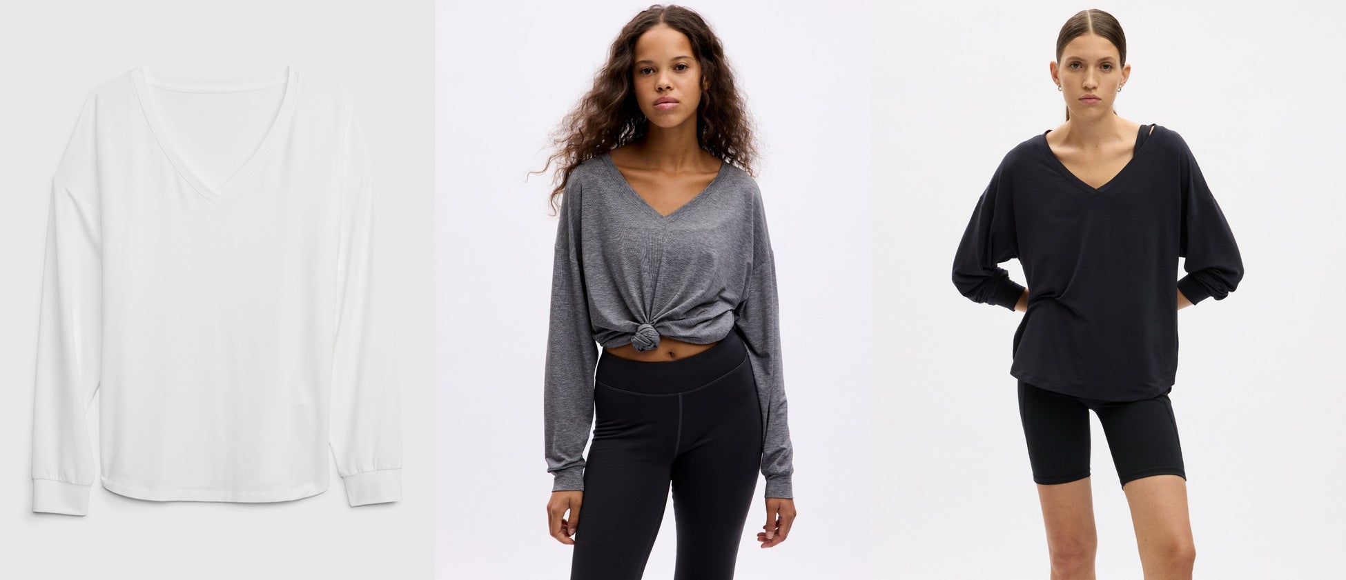 今季は、動きやすく型崩れしにくいストレッチ素材を採用し、吸汗速乾機能で快適なアメジストカラーのブラキャミと、ボディラインに沿い肌への不快感を無くすフラットロックシームを採用したパワーフルレングスレギンスから、ヘリンボーン柄が新登場。素材はリサイクルポリエステルを使用し、地球環境にも配慮しています。心地よい着心地を実現する吸汗性や、熱を素早く外へ逃がす放熱性に優れたGapオリジナル素材「BREATHE(ブリーズ)」のVネックTシャツは、ホワイト・グレー・ブラックがラインナップします。