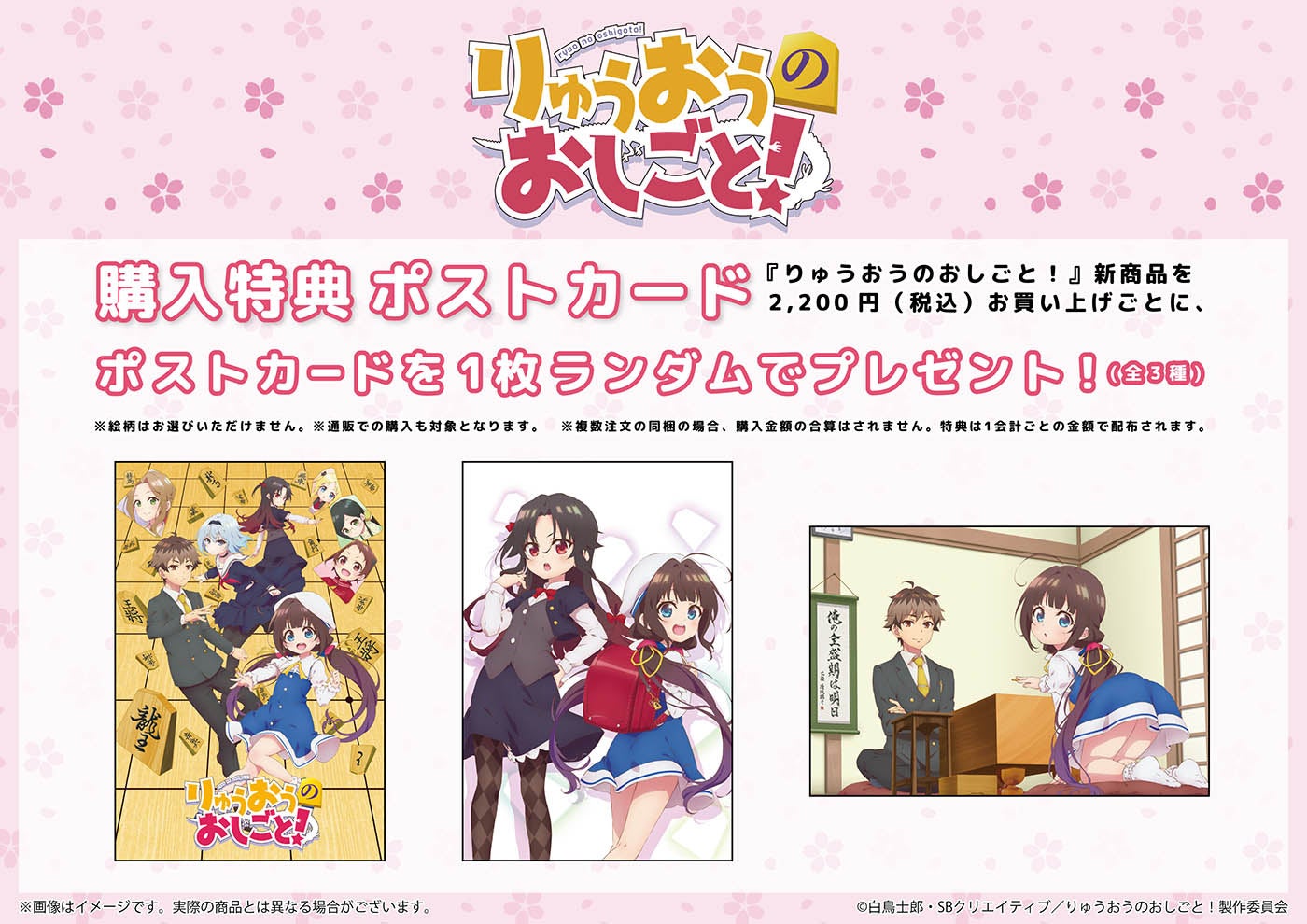 今回発売したTVアニメ『りゅうおうのおしごと!』の新作グッズを2,200円(税込)お買い上げごとに、購入特典としてポストカード(全3種)をランダムで1枚プレゼント!