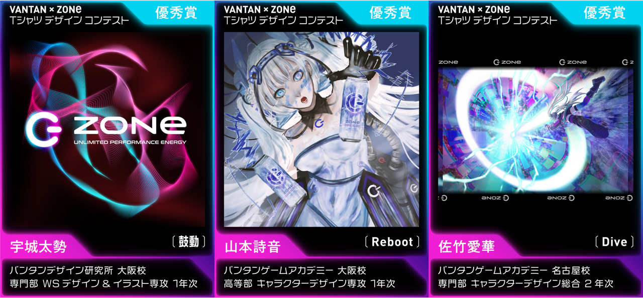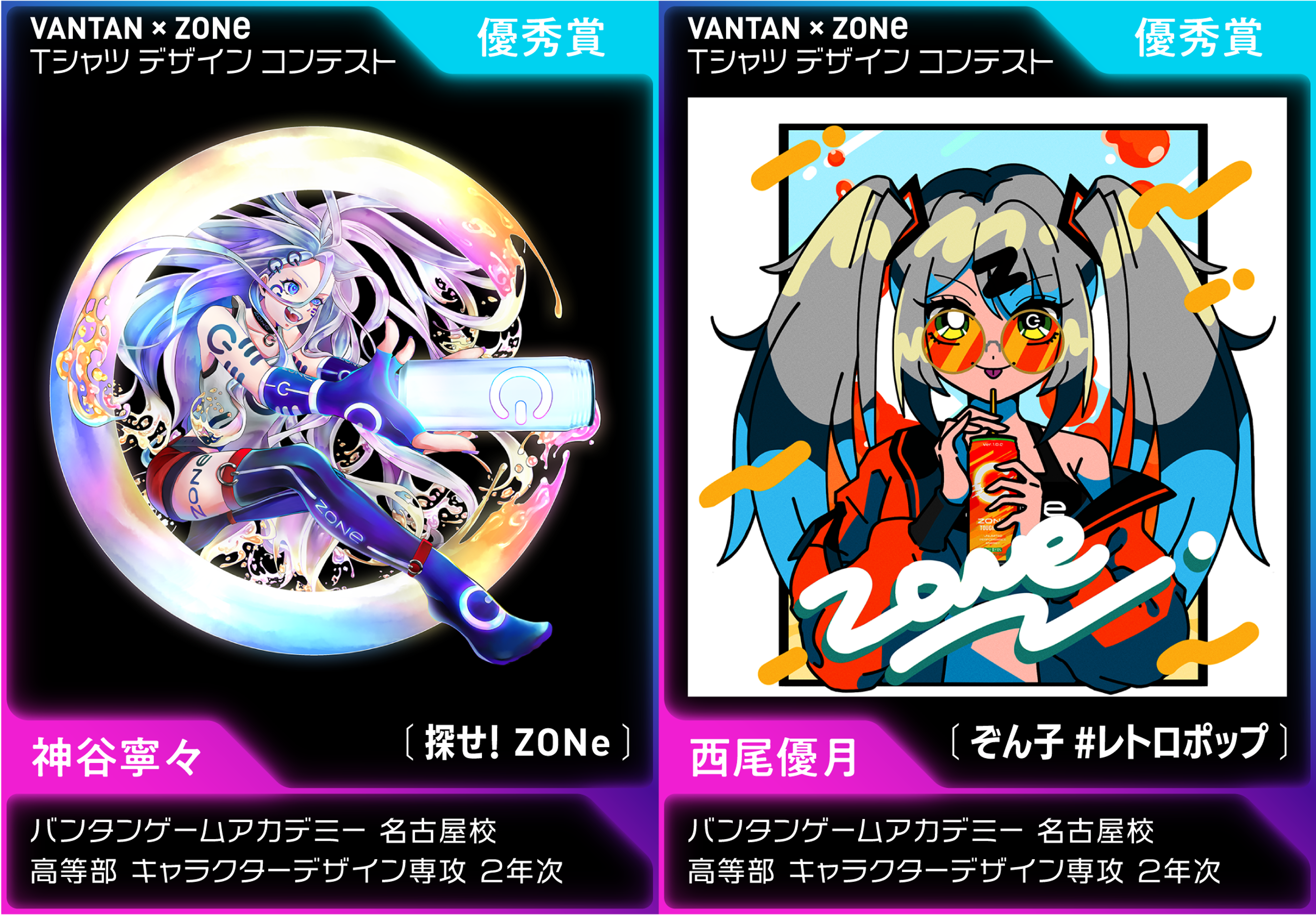 最優秀賞・優秀賞の9作品は、スクール名、作者名とともに本日から順次ZONe公式SNS(Instagram= @zone_energy_jp、Twitter= @zone_energy_jp)、およびバンタン公式SNS(Instagram= @vantan_since1965、Twitter= @VantanChannel)で紹介し、受賞者各々にZONe1ケース(24缶)を贈呈。最優秀賞の作品はTシャツを制作します。