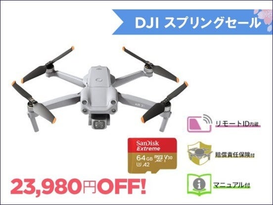 日本初のDJI正規販売代理店である株式会社セキド(本社:東京都港区、代表取締役:大下貴之)では、開催中のカメラ&ドローンがお得な「DJI スプリングセール 」に、性能と価格のバランスが人気の本格ドローン「DJI AIR 2S」と超小型・超広角のウェアラブル対応アクションカメラ「DJI ACTION 2」を追加いたしました。全4モデルが対象のDJI史上最大規模のセールは、抜群の安定性を誇るDJI製品で手軽な高画質撮影を始める絶好のチャンスです。